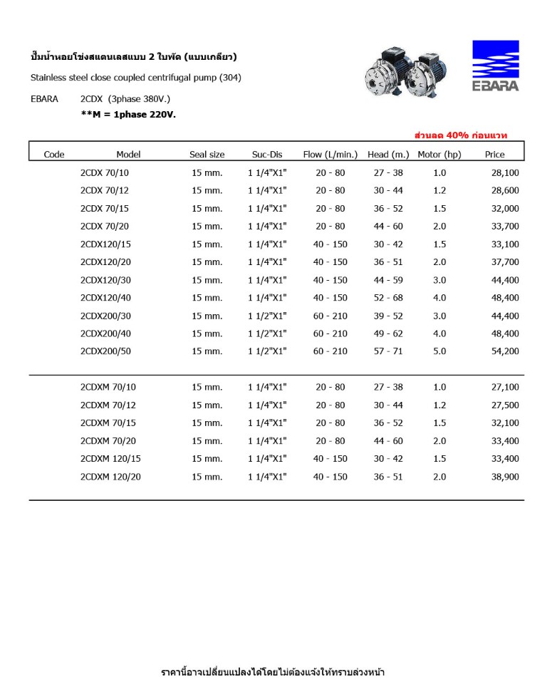 ปั๊มน้ำหอยโข่งสแตนเลสแบบ 2 ใบพัด รุ่น 2CDX