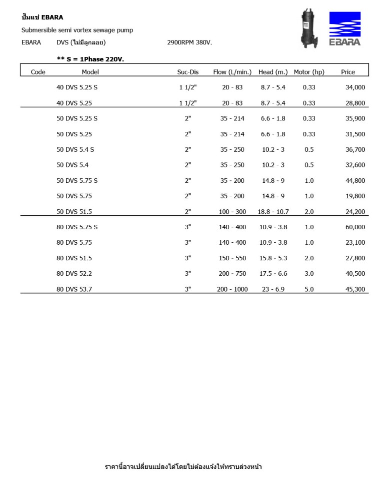 ปั๊มแช่ EBARA (ไม่มีลูกลอย) รุ่น DVS