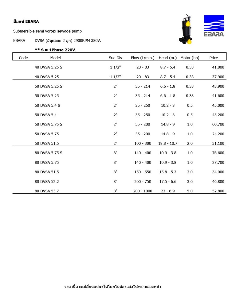 ปั๊มแช่ EBARA (มีลูกลอย 2 ลูก) รุ่น DVSA